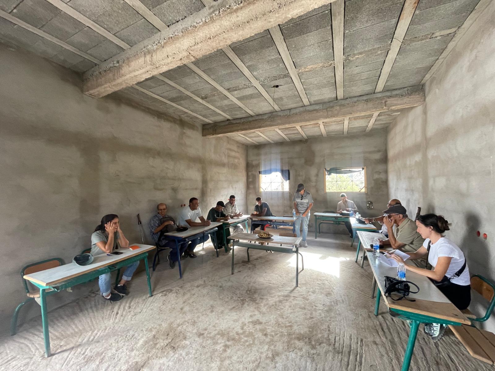 Les équipes ont commencé par une visite de terrain de la commune de l’Ouneine où elles ont pu rencontrer les associations locales et faire le bilan des activités déjà réalisées et/ou prévues, en partenariat avec Targa-Aide. Des problèmes persistants liés au stress hydrique ont été décelés lors des diagnostics préalables, donnant lieu à deux projets : la réhabilitation et l’extension du système d’assainissement du douar Toug El Kheir ; et le réaménagement de la rigole principale pour améliorer le système d’irrigation d’Adouz. Une visite complète du foyer féminin a également été effectuée, permettant aux différentes parties de réfléchir à sa reconstruction, mais également à la future gestion du foyer une fois terminé pour garantir sa pérennité, au vu de son importance pour développer le tissu associatif local et les initiatives féminines.