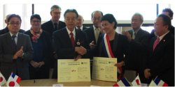 Kentaro Iwai, maire de Tomioka et Nathalie Nieson, maire de Bourg-de-Péage, ont signé un pacte d’amitié le 4 novembre 2015.