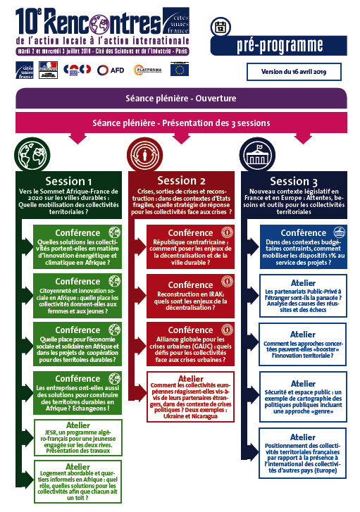 Le rôle d’une tête de réseau comme Cités Unies France est multiple : il s’inscrit d’abord dans les enjeux de construction collective de territoires durables d’o๠le fil rouge conducteur de ces Rencontres, et il se décline dans les 3 sessions proposées :