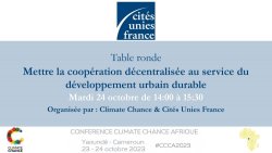 Cités Unies France a participé à la Conférence Climate Chance Afrique les 23 et 24 octobre 2023 à Yaoundé, à l'Institut Français du Cameroun. Cet évènement a réuni une grande diversité d'acteurs issus de l'ensemble du continent africain (personnalités de haut niveau, experts, (…)