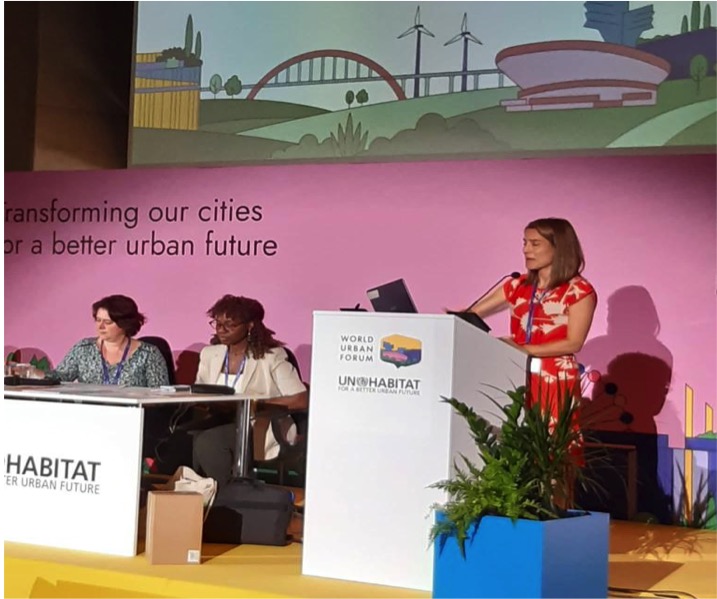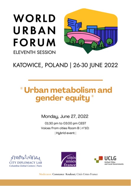 Pour la 11ème fois depuis 2001, ONU-Habitat a réuni du 26 au 30 juin à Katowice, en Pologne, plusieurs centaines de participants autour du Forum Urbain Mondial, évènement qui vise à questionner et mettre en avant la problématique de la résilience des villes et des territoires face aux défis mondiaux. Pour cette occasion, le groupe thématique Genre de Cités Unies France a organisé en partenariat avec City Diplomacy Lab et Cités et Gouvernements Locaux Unis, une session sur le métabolisme urbain et l’équité de genre. Cette conférence s’est tenue le 27 juin en format hybride et a permis aux collectivités et associations du monde entier d’avoir des idées concrètes et des outils pour prendre en compte l’égalité femmes-hommes dans le secteur de l’urbanisme, visant à rendre les territoires plus inclusifs.