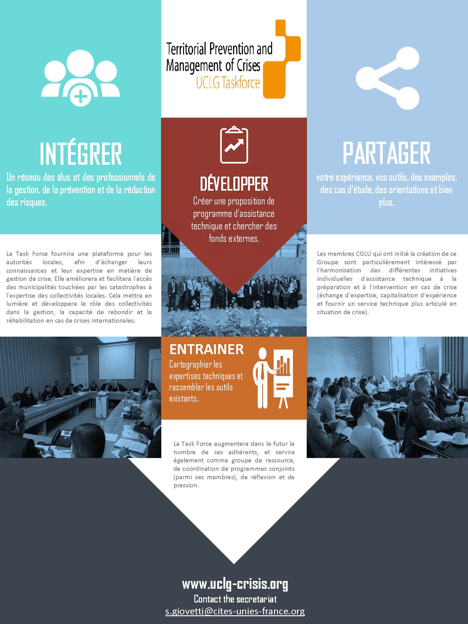Pour plus d'informations sur la Task Force Prévention et Management Territoriaux des Crises, vous trouverez ci-joint un flyer présentatif. Un site Internet a également était mis en place : www.uclg-crisis.org.