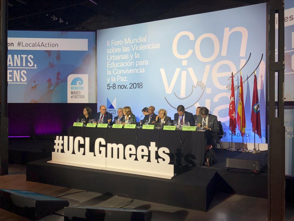 Les sessions organisées dans le cadre du Forum ont vu la participation de nombreux membres de CGLU qui ont partagé les expériences et les réalités de leur ville, défendant le point de vue de la maire, Manuela Carmena, selon lequel les gouvernements locaux peuvent enseigner comment résoudre les conflits et la violence.