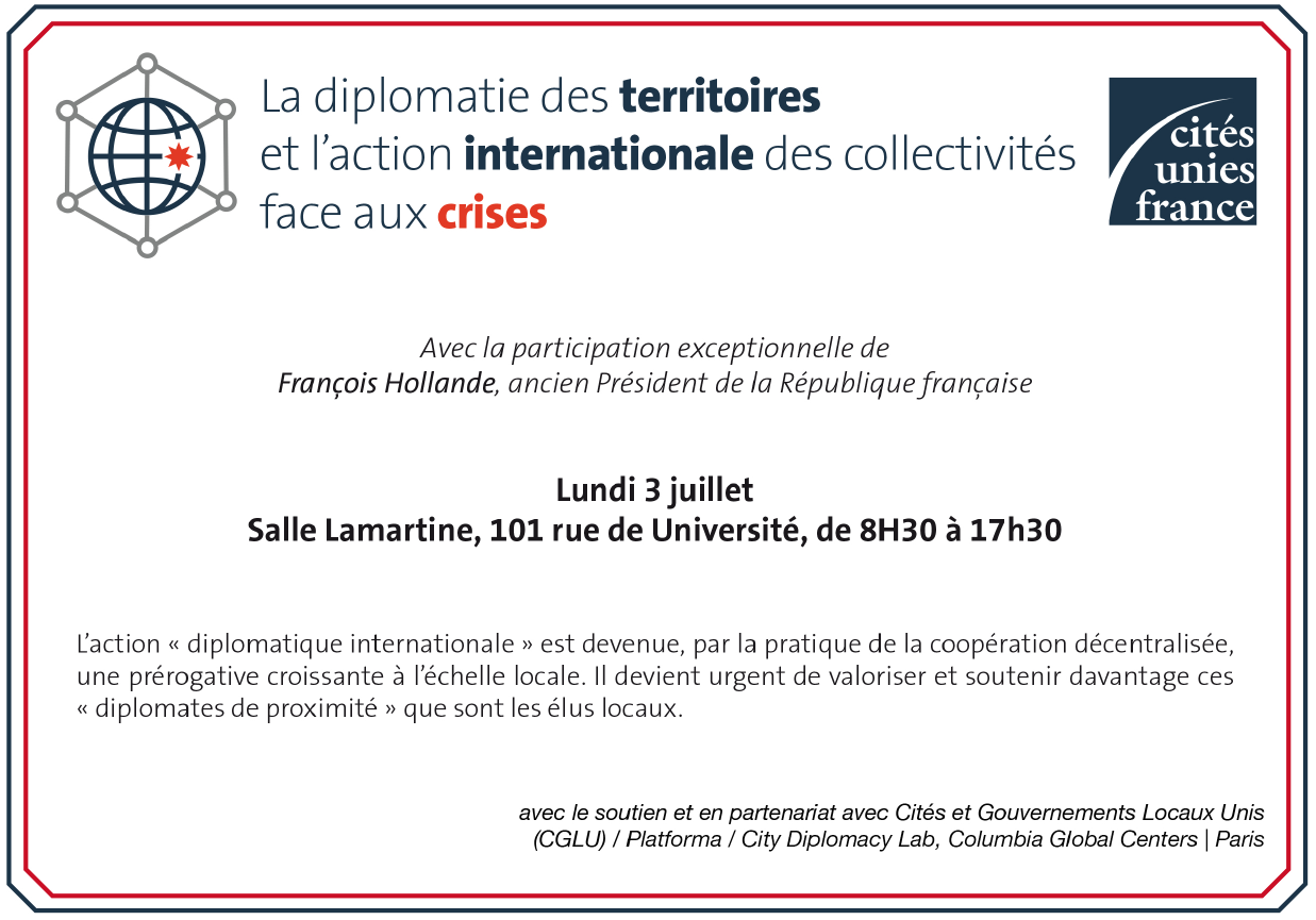 Cités Unies France a organisé un colloque exceptionnel sur la diplomatie des territoires et l’action internationale des collectivités face aux crises, le lundi 3 juillet 2023, en partenariat avec Cités et Gouvernements Locaux Unis (CGLU), PLATFORMA et City Diplomacy Lab.