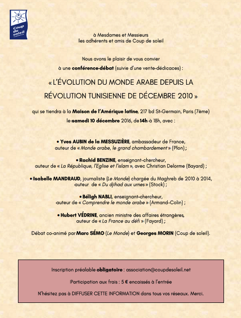 Cette conférence-débat aura lieu le samedi 10 décembre 2016 à la Maison de l’Amérique latine, 217 Bd Saint-Germain, Paris (7ème).