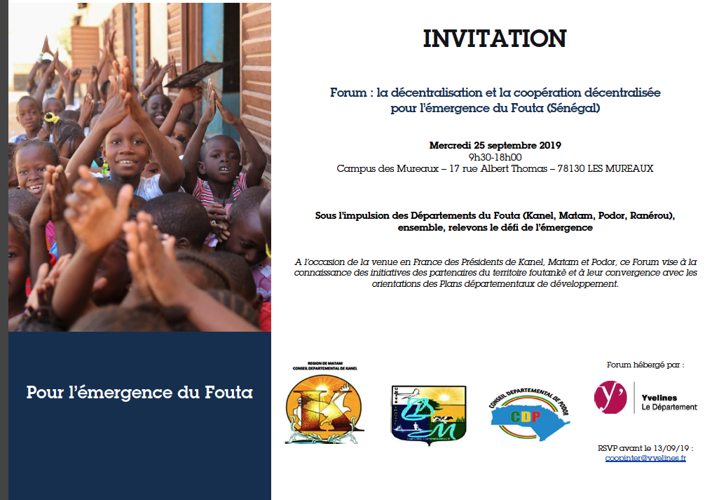 Le Conseil départemental des Yvelines organise le Forum : " La décentralisation et la coopération décentralisée pour l’émergence du Fouta (Sénégal) ", le mercredi 25 septembre 2019, 9h30-18h00, Campus des Mureaux – 17 rue Albert Thomas – 78130 LES MUREAUX.