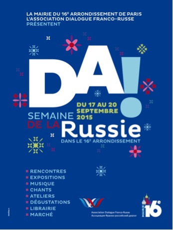 L’Association Dialogue Franco-Russe et la Mairie du 16e arrondissement de Paris présentent, du 17 au 20 septembre 2015, une Semaine de la Russie « DA ! » et son panel d’évènements tantôt divertissants tantôt instructifs mais toujours chaleureux et ouverts à tous : expositions, conférences, ateliers, cinéma, concerts et spectacles, marché….
