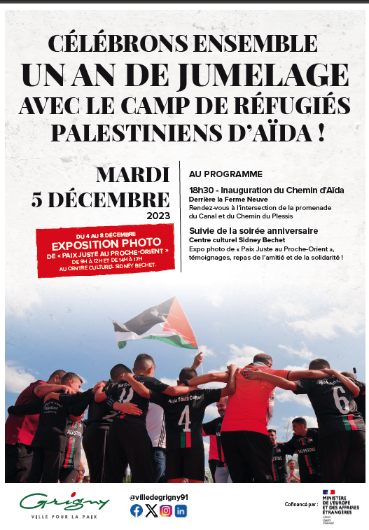 Le mardi 5 décembre prochain, à partir de 18h30, aura lieu la célébration du premier anniversaire du jumelage entre la ville de Grigny et le camp de réfugiés palestiniens d’Aïda en Cisjordanie.