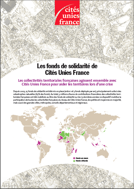 Depuis 2003, 24 fonds de solidarité ont été mis en place (entre 1 et 3 fonds déployés par an), principalement suite à des catastrophes naturelles (65% des fonds). Au total, 3M€ de contributions financières des collectivités territoriales françaises ont été mobilisés au titre des fonds de solidarité sur les 15 dernières années. Le dispositif mobilise la participation de toutes les collectivités françaises du réseau de Cités Unies France, des petites et moyennes en majorité, mais aussi des grandes villes, métropoles, conseils départementaux et régionaux