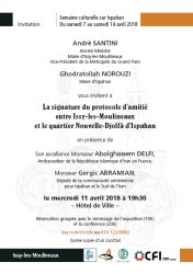 Dans le cadre de la semaine culturelle iranienne du 7 au 14 avril, la Ville d'Issy-les-Moulineaux va signer un protocole d'amitié avec le quartier arménien d'Ispahan, la Nouvelle-Djolfç. Les deux communes souhaitent poser les premiers jalons d'une relation amicale basée sur la culture, les arts, l'urbanisme et le développement durable.