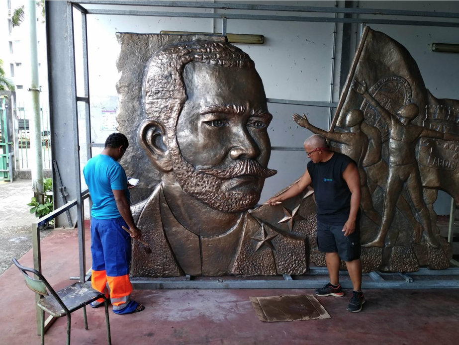 – La finition du portrait du Général Antonio Maceo, héros de la lutte pour l’indépendance de Cuba. Cette oeuvre se situera sur la place de l’Hôtel de Ville du Lamentin, place dédiée à la coopération. La photo ci-contre montre les deux artistes en pleine réalisation pour l’inauguration du 15 juin 2019.