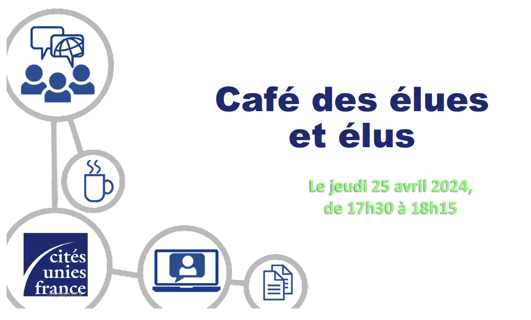 J’ai le plaisir de vous inviter au prochain « Café des élues et élus de Cités Unies France » qui se tiendra jeudi 25 avril prochain, de 17h30 à 18h15 en visioconférence.