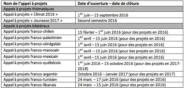 Ce communiqué est aussi disponible en ligne à l’adresse suivante : http://www.diplomatie.gouv.fr/fr/politique-etrangere-de-la-france/action-exterieure-des-collectivites-territoriales/actualites-et-agenda-de-l-aect/actualites-de-l-aect/article/calendrier-2016-des-appels-a-projets-du-maedi-en-soutien-a-la-cooperation.