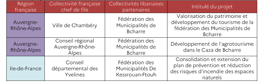 Cet appel à projets visait à consolider les partenariats en cours, à favoriser de nouvelles coopérations entre le Liban et la France et mettait l’accent sur les formations des agents et élus des municipalités libanaises. Cette initiative a démontré la volonté des deux pays de développer la coopération entre ses autorités locales respectives au bénéfice des populations.