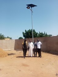 Lampadaire solaire dans la commune de Fatoma (Région de Mopti). De gauche à droite : Aboubacar Sangaré, Youssouf Diakité, Amadou Dicko, le responsable de la jeunesse de la commune