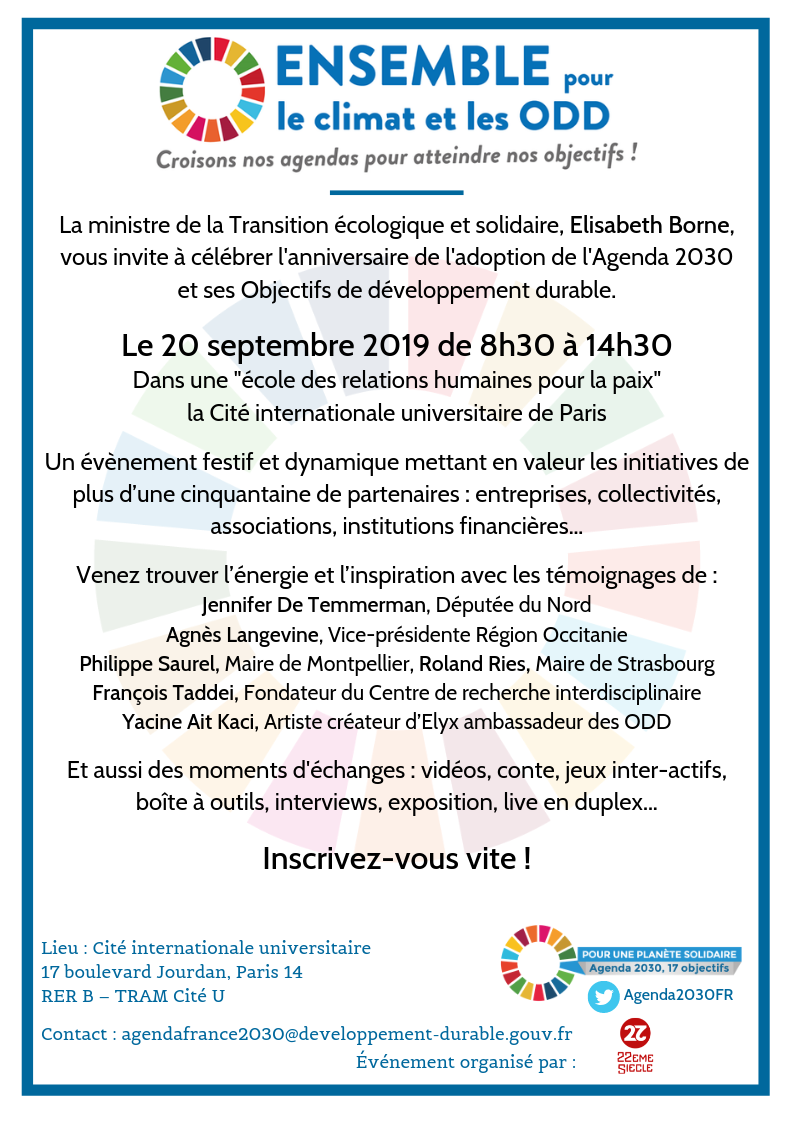 La Ministre de la Transition écologique et solidaire, Elisabeth Borne, vous invite à célébrer l’anniversaire de l’adoption de l’Agenda 2030 et ses Objectifs de développement durable, le 20 septembre 2019, de 8h30 à 14h30, dans une "école des relations humaines pour la paix" - Cité internationale universitaire de Paris.
