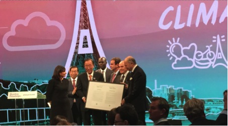 Pari réussi : le 4 décembre 2015, à l’issu d’un sommet ayant réuni 800 maires et présidents d’exécutifs locaux venus des quatre coins du monde, Madame Anne Hidalgo, Maire de Paris, remettait avec le président de CLU, Kadir Taopbas, les co-présidents de CGLU et Michael Bloomberg, président du C40, la Déclaration de Paris à Ban Ki-Moon, Secrétaire général des Nations Unies et Laurent Fabius, Président de la COP.