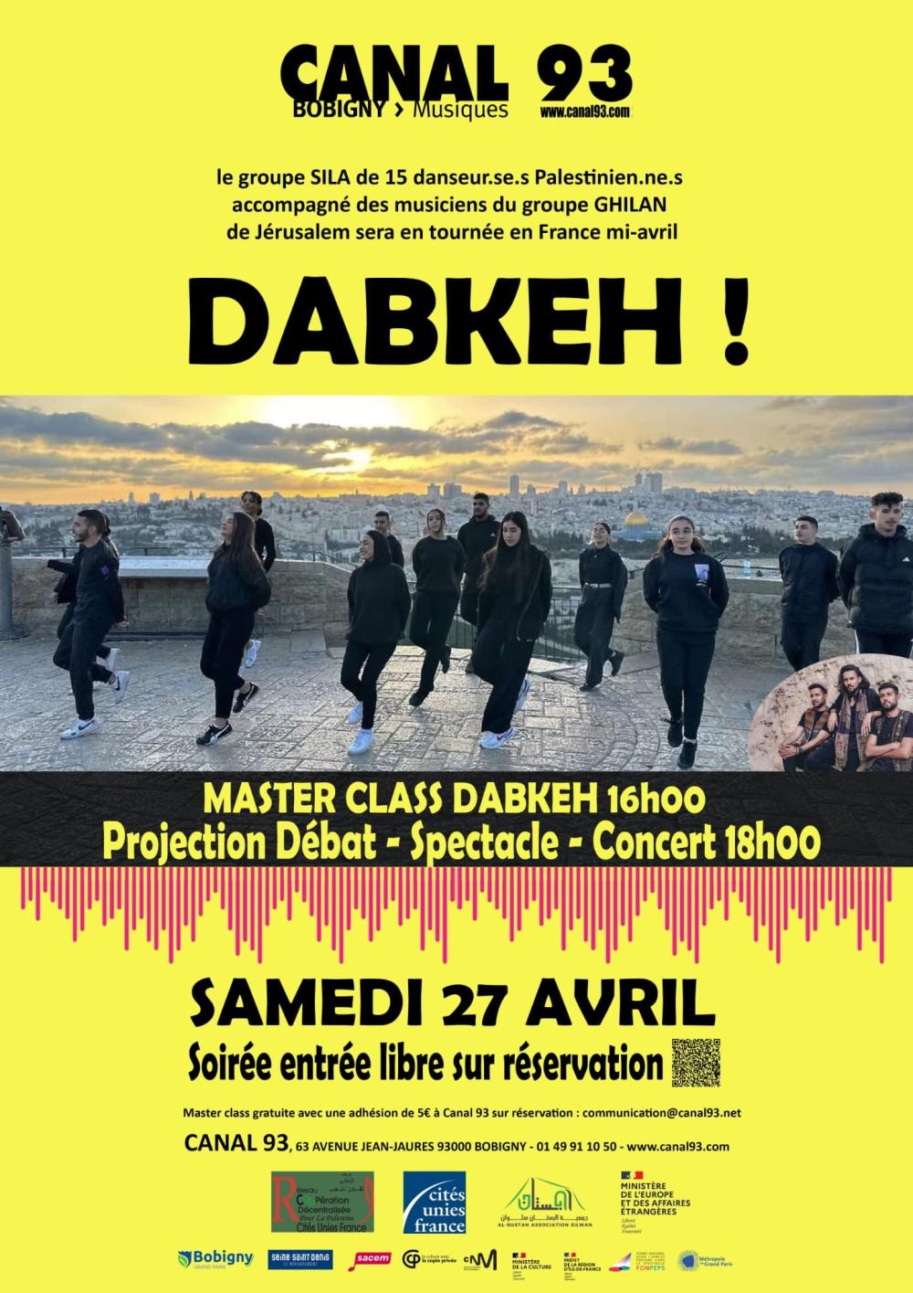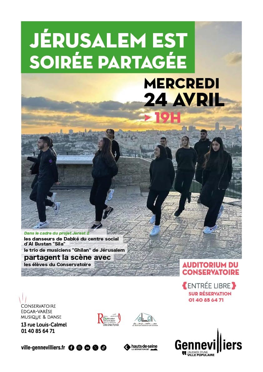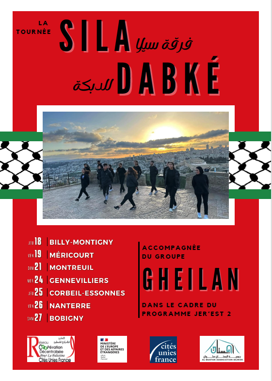 Dans le cadre du programme JER’EST 2, la troupe de Dabké du centre social Al Bustan « Sila », accompagnée par le trio de musiciens « Gheilan », réaliseront une tournée dans plusieurs collectivités d’Ile de France et du Nord-Pas-de-Calais, du 18 au 27 avril 2024.