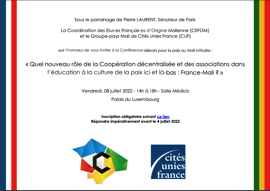 Une rencontre du groupe-pays Mali de Cités Unies France, co-organisée avec la Coordination des élu-es français-es d’Origine Malienne (CEFOM), a eu lieu le vendredi 8 juillet, de 14h00 à 18h00, au Sénat.