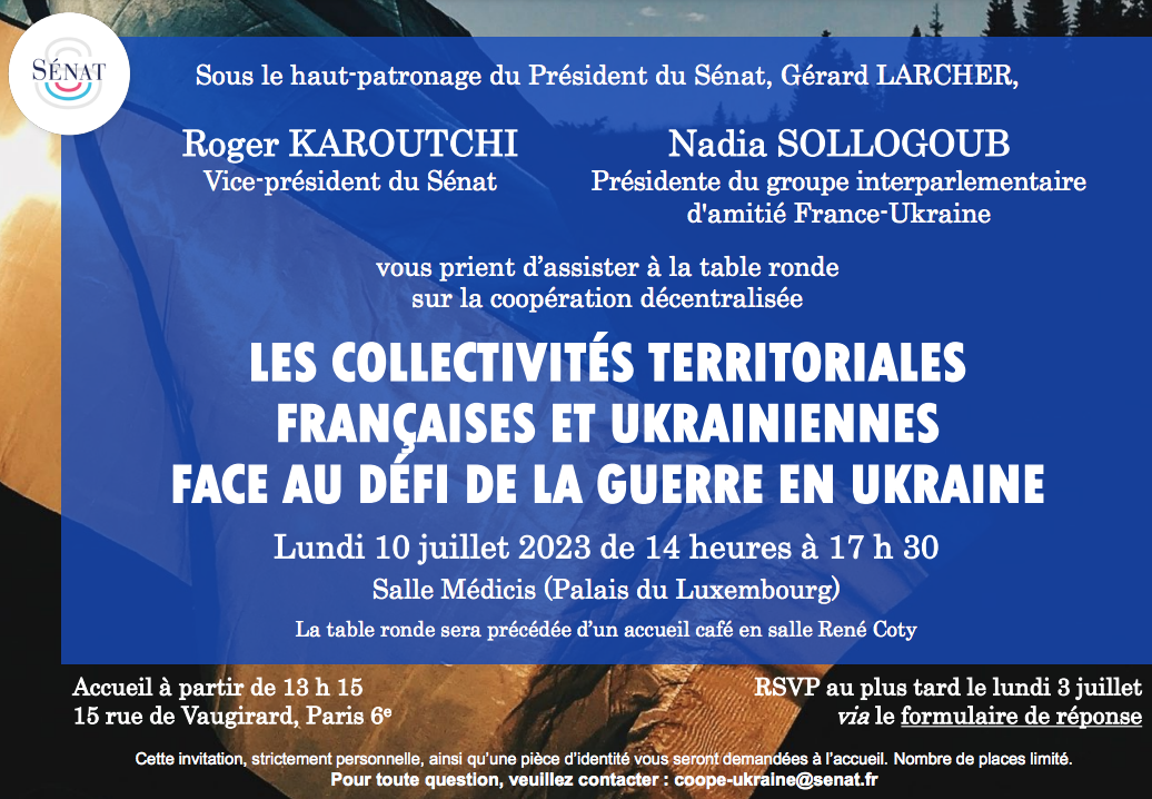 Monsieur Roger Karoutchi, Vice-président du Sénat, et Mme Nadia Sollogoub, Présidente du groupe interparlementaire d’amitié France-Ukraine, vous invitent à assister à la table ronde sur la coopération décentralisée qui se déroulera au Sénat, sous le haut-patronage de son Président, Monsieur Gérard Larcher, sur le thème : « Les collectivités territoriales françaises et ukrainiennes face au défi de la guerre en Ukraine ».