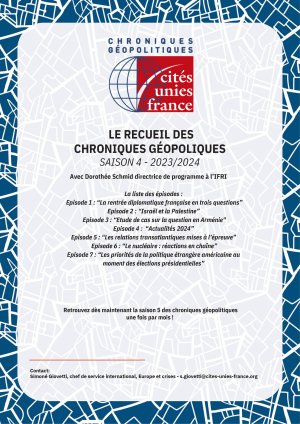 Plongez au cœur de l’actualité géopolitique mondiale avec la quatrième saison des Chroniques Géopolitiques. À travers notre recueil, redécouvrez les comptes rendus détaillés de chaque session et les échanges qui ont marqué cette saison.