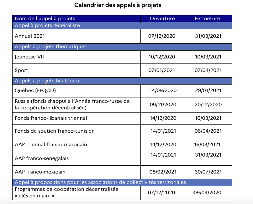 MEAE/DAECT : COMMUNIQUÉ : Calendrier des appels à projets du MEAE en soutien à la coopération décentralisée pour 2021